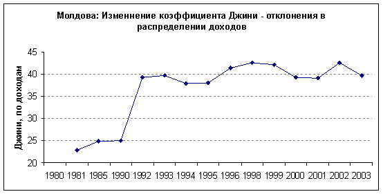 Стереотипом стало утверждение: Молдова - беднейшая страна Европы. К этому следует добавить: ни в одной из 14 пост-социалистических стран Центральной и Восточной Европы не возникло столь резкого как в Молдове социального неравенства между «новыми богатыми» и «новыми бедными». Неравенство в доходах, выраженное в используемом ООН коэффициенте Джини, после 1990 удвоилось и достигло 40-44. ![]() Так, в середине 2004 на долю 20 % наименее обеспеченного населения приходилось только 6.2 % от общего объёма доходов всех домашних хозяйств, а на долю 20 % наиболее обеспеченных семей - 44.2 %. Оживление экономики в последние годы несколько сократило зону бедности в Молдове, но не устранило контрасты неравенства. Между тем в памяти большинства граждан РМ ещё живы реалии “развитого социализма”, когда государство обеспечивало относительное равенство доходов (исключая номенклатурные привилегии и "блат"), которые в основном зависели от зарплаты. Неравенство начало быстро нарастать в переходный период. Сначала – по причине утраты многими людьми работы и их денежных сбережений, а затем – в процессе приватизации предприятий, земли и жилья. Резко увеличились различия в оплате труда в различных отраслях экономики. Кроме того, у предпринимателей появились доходы от теневой экономики, а у работников государственных структур – и от коррупции. Реальная зарплата в Молдове стала расти с середины 90-ых гг. – за период 1997-2003 на 7.7 %, а после 1999 – на 14.7 % ежегодно. Одновременно, однако, нарастали и контрасты. Если в 1996 году зарплата в сельском хозяйстве составляла 2/3 от средней по национальной экономике, то в 2003 – ½. Такая же тенденция имела место в здравоохранении и образовании. Выше среднего по стране уровня в 2003 году заработная плата была в строительстве, промышленности, на транспорте, а также в сфере государственного управления и в 3 раза - в финансовом секторе. Как ни странно, но усилению неравенства способствуют и трансферты валюты из-за границы. Поскольку туда уехала на заработки самая инициативная и образованная часть населения, то на 70 % их трансферты оседают в небедных домохозяйствах, и используются не только на потребление, но и для “семейных инвестиций” – на образование детям, покупку жилья, земли и в малый бизнес. Мало помогают уменьшению неравенства и ныне действующие государственные программы социальной помощи. Предоставление помощи осуществляется по категориям граждан, а не по нуждаемости. В результате, согласно оценке Министерства экономики (2003), только 6.6 % социальных трансфертов (без пенсий) приходилось на долю 20 % наименее обеспеченного населения, а 46.0 % - на долю 20 % наиболее обеспеченных семей – получателей такой помощи.
