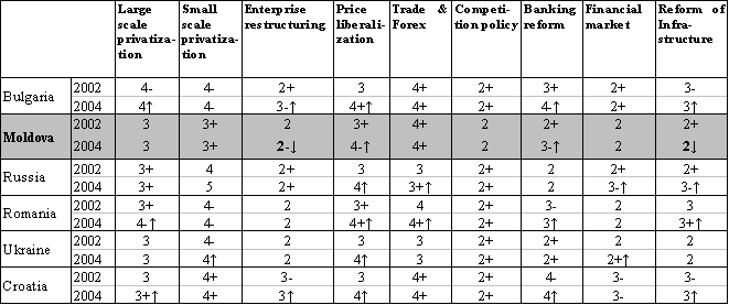 With regard to Moldova’s possible European integration, it is necessary to foresee the price that will be necessary to pay for this, and in particular, not only within the process of a preparatory period, but also after full EU membership. In the EU-15 countries prices are nearly the same. At the same time, only the introduction of higher excise duties on oil products, which is subject to strict control, leads to an increase in prices for transportation or public utilities. Besides, along with the introduction of a single European currency, as the experience of the EU-12 countries suggests, prices go up by 20-25%. Therefore, during the elaboration of the national programme for implementation of the Moldova EU Action Plan (targets and terms of their achievement - intentions and possibilities) it is possible and necessary to address the experience of EU countries. In the nineteen fifties the founding fathers of the European Community appealed for a small steps strategy rather than a grand design. Such an approach can lay the foundation for Moldova’s European integration strategy. Only the broad involvement of a lively, interested, including financially solvent, “player” will make the approaching really meaningful. It is important that there is social support. In particular, it is crucial that most of the population is involved in the process of democratic and structural reforms and the creation of a state based upon the rule of law. The movement towards European integration will become more intensive only when all its participants – government, business and civil society are ready for integration and are aspiring towards it. [1] Communication from the Commission to the Council and the European Parliament «Wider Europe – Neighbourhood: A New Framework for Relations with our Eastern and Southern Neighbours», COM(2003) 104 final [2] Partnership and Cooperation Agreement. Article. 4 [3] Communication from the Commission to the Council and the European Parliament «Wider Europe – Neighbourhood: A New Framework for Relations with our Eastern and Southern Neighbours», COM(2003) 104 final [5]The scores range from 1 to 4+, where 1 represents little or no change from a planned economy and 4+ represents the standard of an advanced market economy. Pointers ↑↓ show the change in areas of transition. The table is based on information from EBRD Transition Reports for 2002 and 2004.